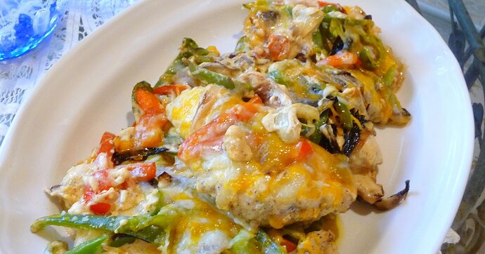 Such a delicious meal!! The creamy, flavorful Fajita sauce is spread underneath and on top of the slightly precooked chicken breasts. Then arrange stir-fried onions and peppers over the top. Sprinkle with grated Mexican Blend cheese and bake! A quick, delicious and very easy meal for a weeknight supper that your family will love.